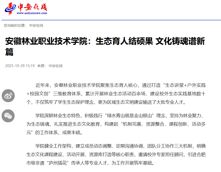 近日,省級(jí)媒體“中安在線”對(duì)我院生態(tài)文化教育工作進(jìn)行了報(bào)道。近年來...